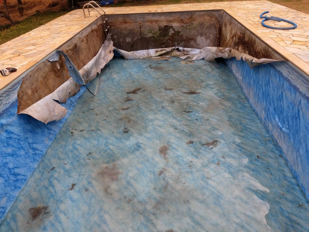 Essa piscina, localizada em Extrema, MG, estava abandonada há muitos anos. Quando o novo proprietário adquiriu a casa, já se encontrava nesse estado. Embora fosse uma estrutura de alvenaria, ela estava revestida com uma capa azul de vinil, que precisou ser completamente removida antes da higienização.